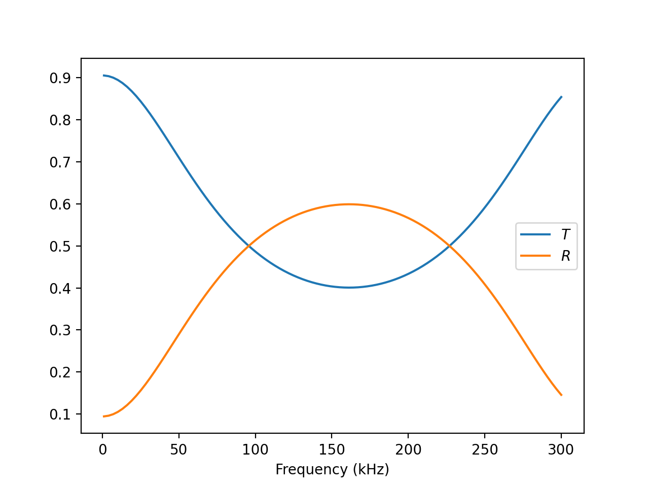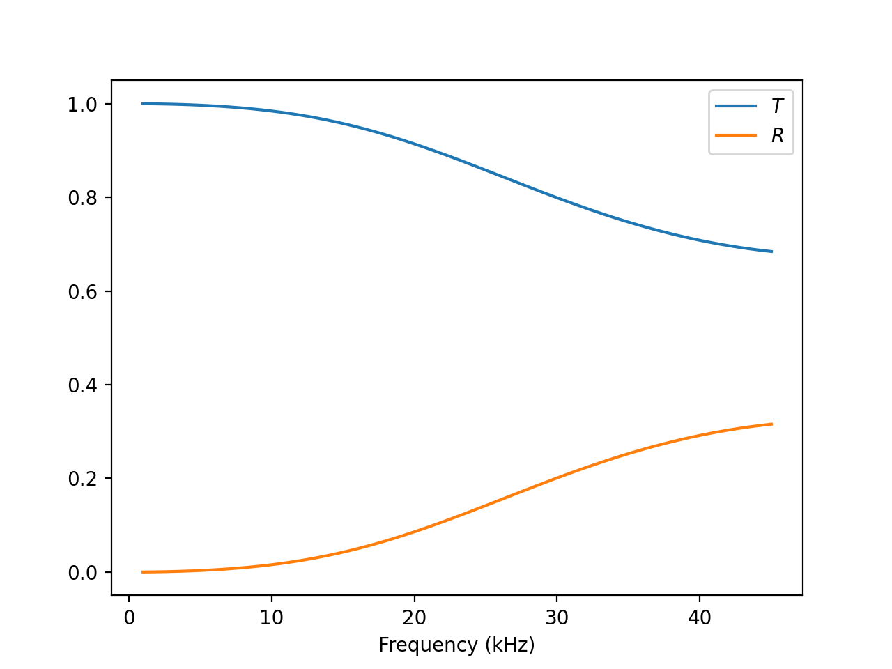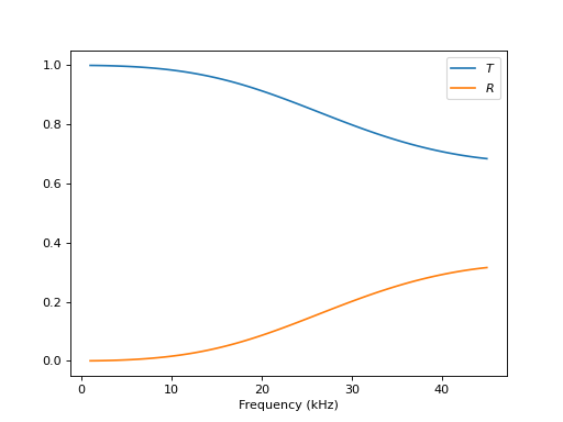 The setup is fairly simple. The materials are given in order from negative to positive z coordinates. We simply loop over the wave number and calculate transmission and reflection.